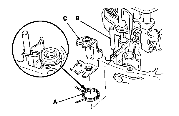 9. Set the select return spring (A), the 8 x 50 mm pin (B), and the interlock (C) as shown.
