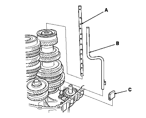 32. Install the select lock pin spring (A), the select lock pin (B), and the reverse lockout solenoid (C).