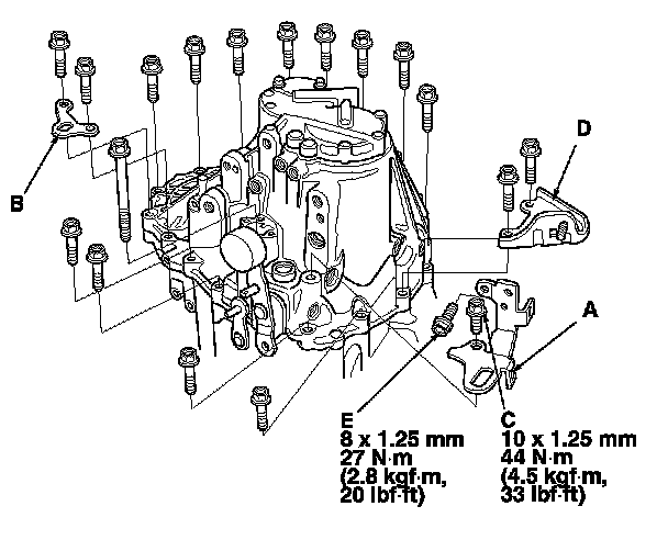 23. Install the 10 x 42 mm flange bolts and the 10 x 20 mm flange bolts (C) finger-tight with transmission hanger A, transmission hanger B, clutch line bracket (D), and the 8 x 16 mm flange bolt (E).
