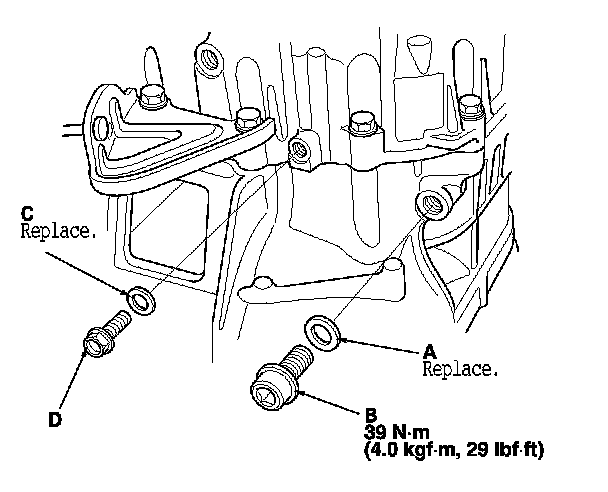 25. Install the new 14 mm sealing washer (A), the drain plug (B), and the new 6 mm washer (C), and install the oil check bolt (D) by finger-tight.