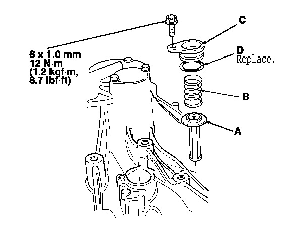 34. Install the oil pump strainer (A), the strainer set spring (B), and the strainer cover (C) with the new O-ring (D).