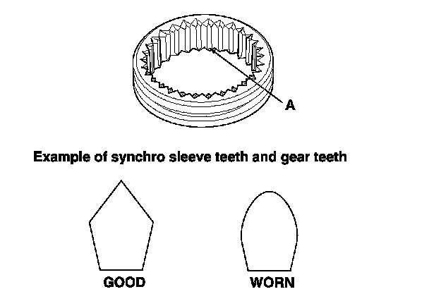 3. Inspect the teeth (A) on each synchro sleeve and matching teeth on each gear for wear (rounded off).