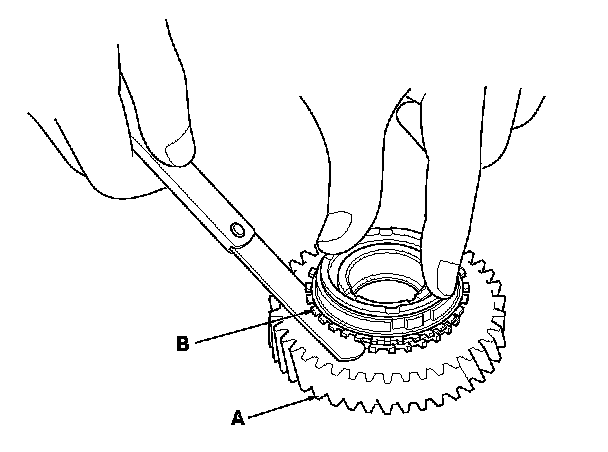 2. Inspect the inside of each synchro ring (B) for wear.