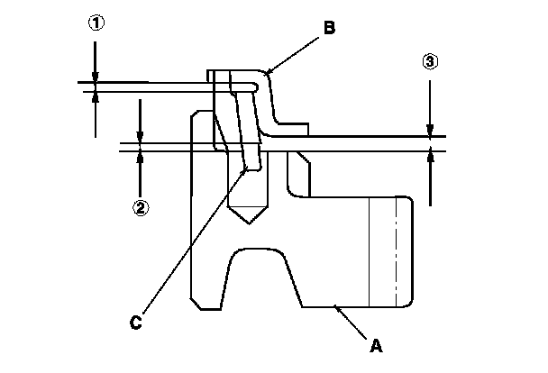 9. Measure the clearance between each gear (A) and its synchro ring (B) all around the gear. Hold the synchro ring against the gear evenly while measuring the clearance. If the clearance is less than the service limit, replace the synchro ring and gear.