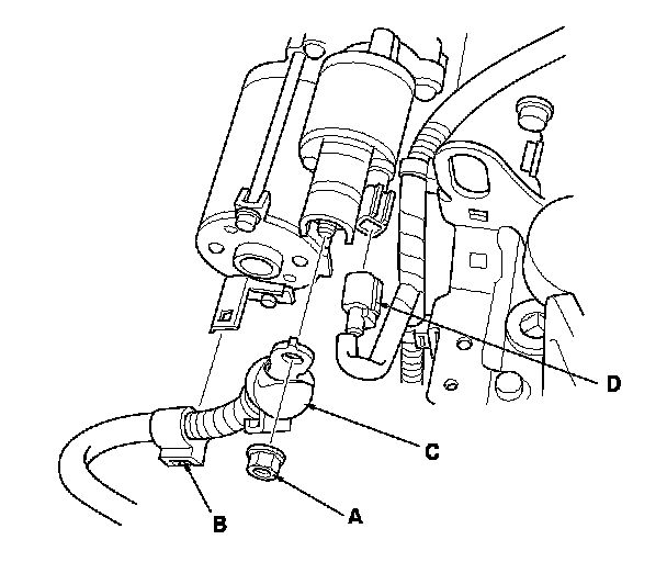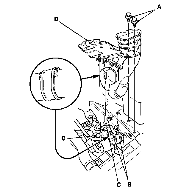 26. Remove the three upper transmission mount bracket bolts (A), the upper transmission mount bracket (B), the ground cable mounting bolt (C), and the ground cable (D).
