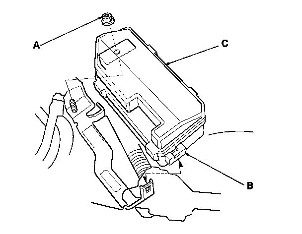 8. Remove the nut (A) and the clamp (B), then move the under-hood fuse/relay box (C) out of the way.