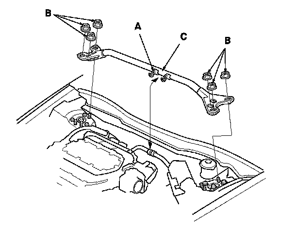 9. Remove the harness from the clamp (A) and the nuts (B), then remove the strut brace (C).