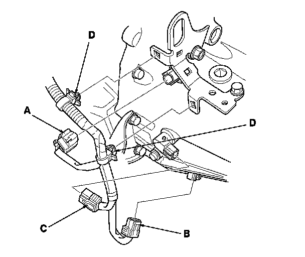 10. Disconnect the back-up light switch connector (A), the input shaft (mainshaft) speed sensor connector (B) and the output shaft (countershaft) speed sensor connector (C), then remove the harness clips (D).