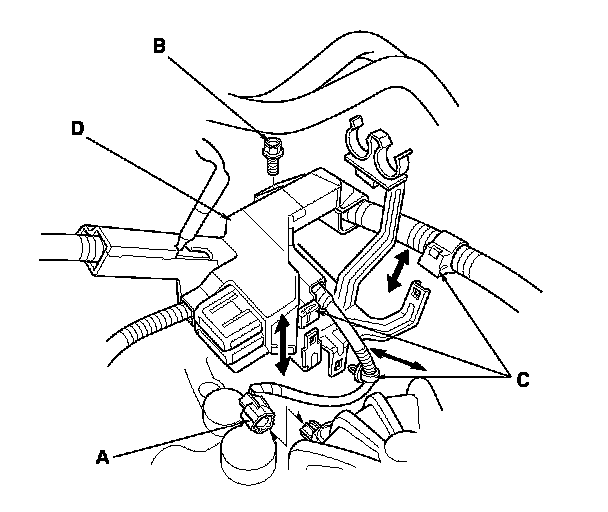 11. Disconnect the reverse lockout solenoid connector (A), remove the harness mounting bolt (B) and the harness clamps (C), then remove the harness (D).