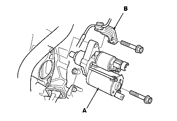 13. Remove the starter (A) and the vacuum hose bracket (B).