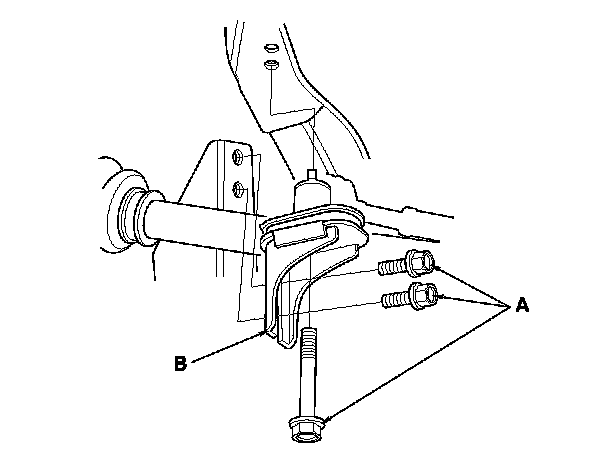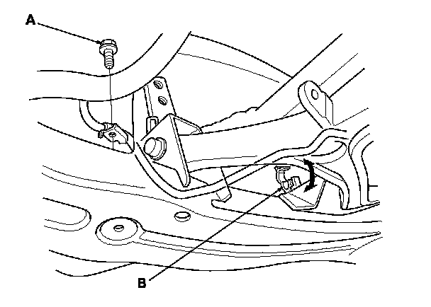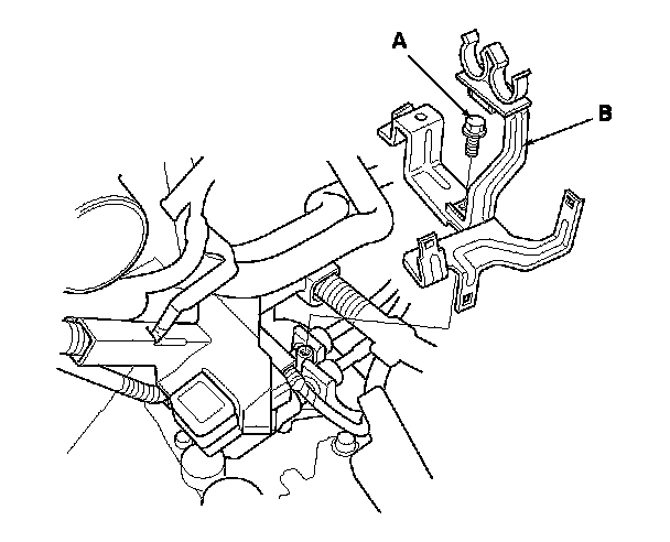 14. Remove the harness bracket mounting bolt (A) and the harness bracket (B).