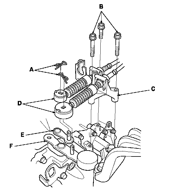 20. Remove the front engine mount stop nuts (A), the front engine mount stop (B), the vacuum hose bracket (C), and the harness bracket (D), then remove the front engine mount bolt (E), and disconnect the vacuum hose (F).