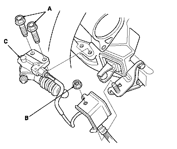 16. Remove the slave cylinder mounting bolts (A) and the bracket mounting nut (B), then carefully move the slave cylinder (C) out of the way to avoid bending the clutch line.