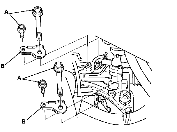 21. Remove the power steering line holder mounting bolt (A), and the power steering hose clamp (B).