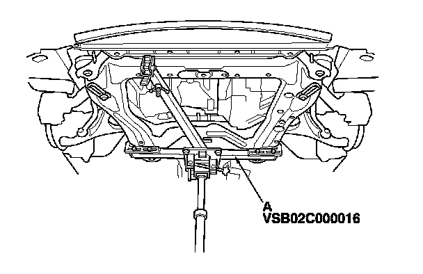 38. Attach the front subframe adapter (A) to the front suspension subframe and hang the belt of the subframe adapter over the front of the subframe, then secure the belt with its stop.
