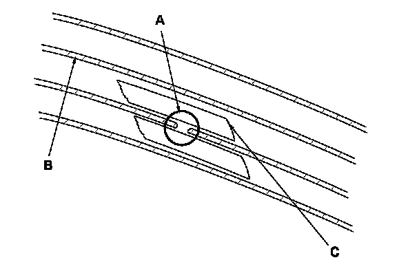 2. Carefully mask above and below the broken portion of the defogger wire (B) with cellophane tape (C).