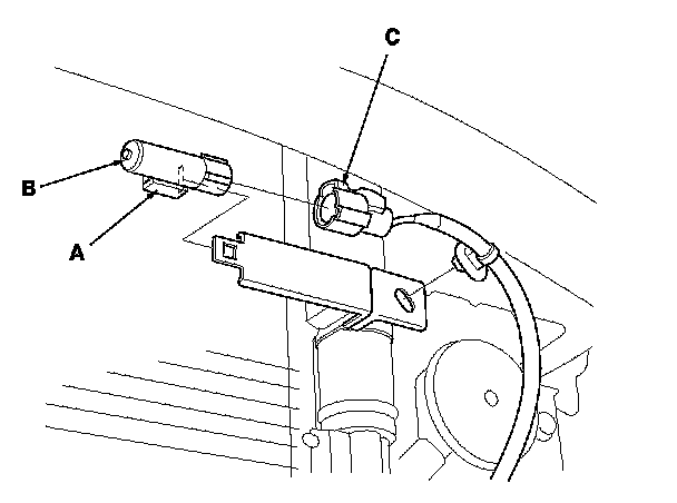 2. Lift the tab (A) to release the lock, then remove the outside air temperature sensor (B) from the receiver/dryer desiccant bracket. Disconnect the 2P connector (C) from the outside air temperature sensor.