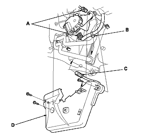 4. Disconnect the connectors (A) from the air mix control motor and heater core temperature sensor, then remove the harness clip (B) and the connector clip (C). Remove the self-tapping screws and the heater core cover (D).