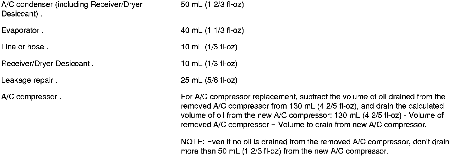 Add the recommended refrigerant oil to the suction port of the A/C compressor in the amount listed if you replace any of the following parts.