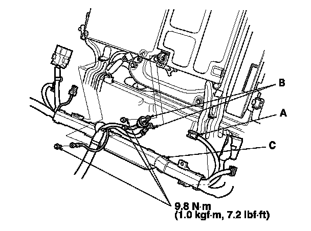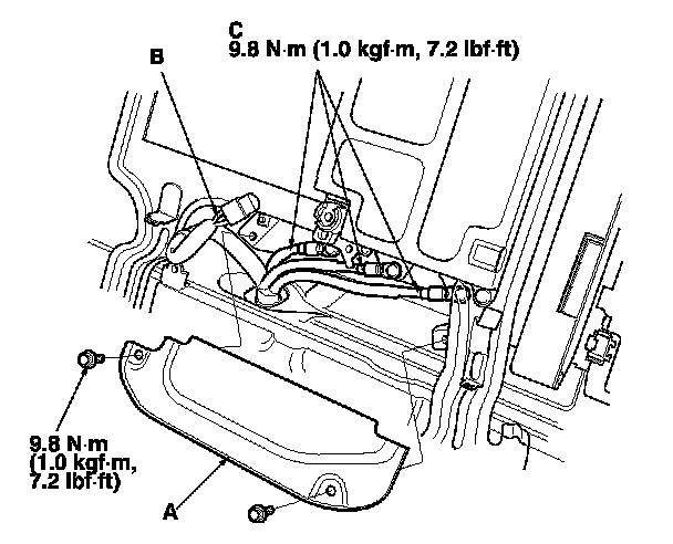 6. Remove the A/C compressor power cable connector (B), and the motor power cables (C), then wrap them with insulating tape.