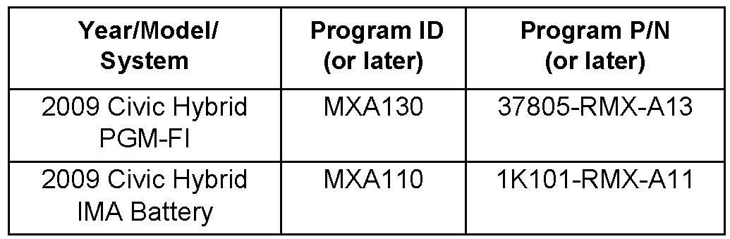 The updated PGM-FI and IMA battery software program IDs and P/Ns are shown below. If these, or later program IDs are the current ones displayed during the update, the software for this service bulletin is already installed.