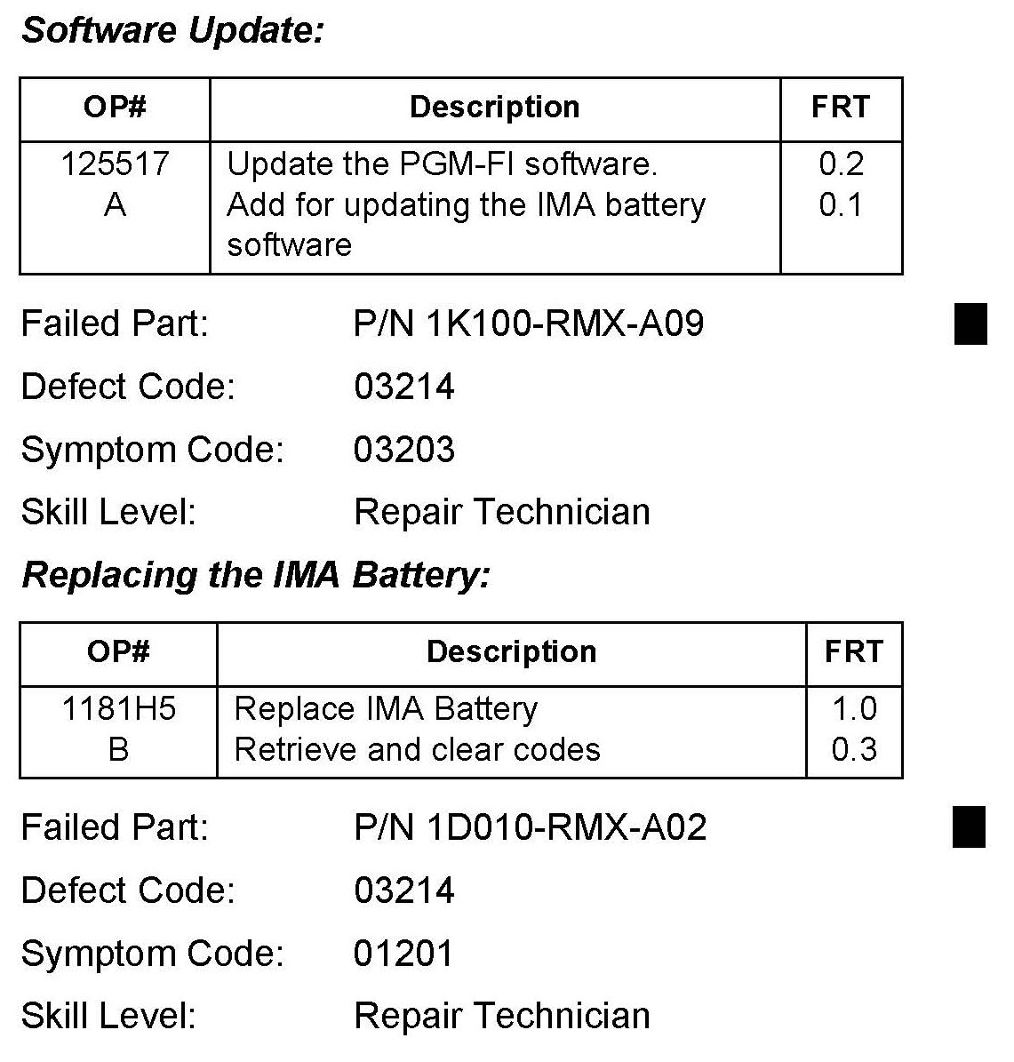 ^ If the IMA battery software version is 1K101-RMX-A11 or later, the IMA indicator is off, and the customer complaint is low power when accelerating from a stop, this service bulletin does not apply, continue with normal troubleshooting.