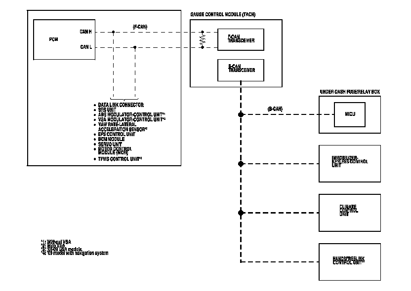 By connecting the HDS to the data link connector (DLC), the HDS can retrieve and indicate the diagnostic results from the MICU via a diagnostic line called K-LINE. The K-LINE is distinguished from the CAN line, and connected to the CAN related ECUs. The MICU is a gateway between the HDS and B-CAN related ECUs, and sends B-CAN diagnostic results to the HDS.
