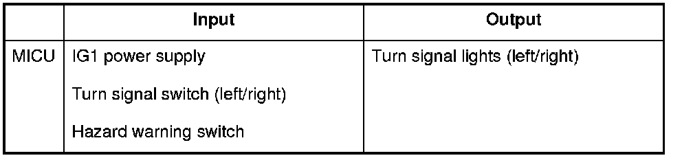 The MICU controls the turn signal/hazard warning lights based upon input signals from the turn signal and hazard warning switches.
