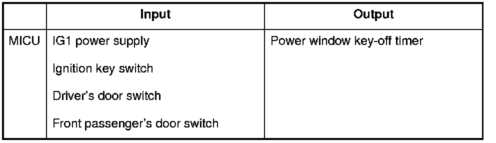 The MICU controls the power windows key-off operation based upon input signals from each switch.