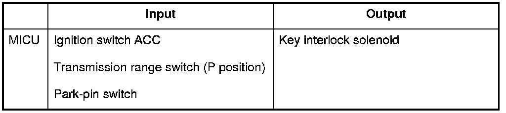 The MICU controls the key interlock solenoid based upon IG1, transmission range switch, and park-pin switch signals.