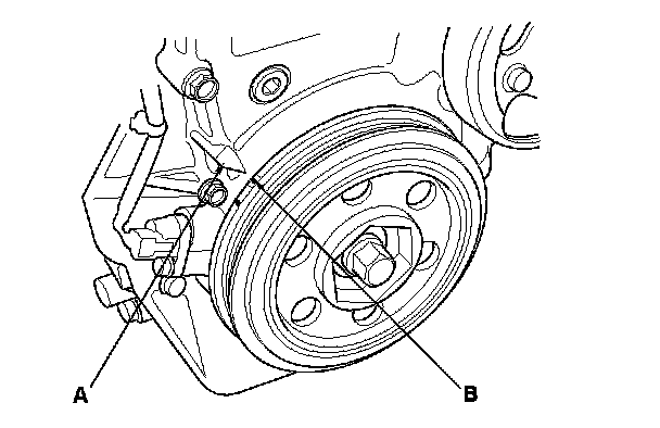9. Aim the light toward the pointer (A) on the cam chain case. Check the ignition timing under a no load condition (headlights, blower fan, rear window defogger, and air conditioner are turned off).