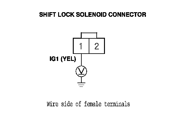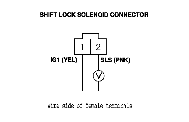 11. Release the brake pedal, and measure the voltage between shift lock solenoid connector terminals No. 1 and No. 2. The shift lever must be in P.
