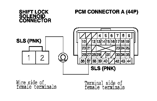 15. Check for continuity between PCM connector terminal A27 and shift lock solenoid connector terminal No. 2.