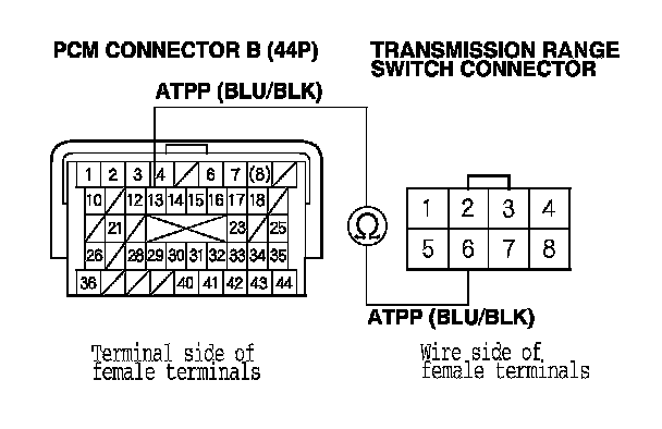 29. Check for continuity between PCM connector terminal B13 and transmission range switch connector terminal No. 6.