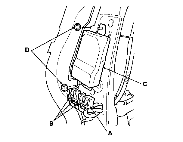 1. Place the ODS unit (A) on the seat-back frame. Tighten the two nuts (B), and connect the ODS unit harness 18P connector (C) and OPDS sensor connectors (D) to the ODS unit.