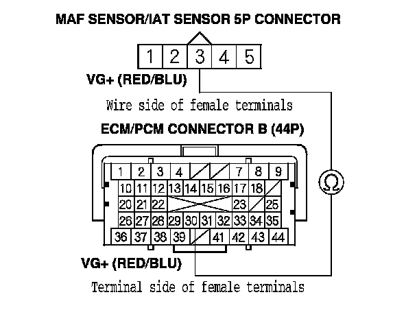 13. Check for continuity between MAF sensor/IAT sensor 5P connector terminal No. 3 and ECM/PCM connector terminal B30.