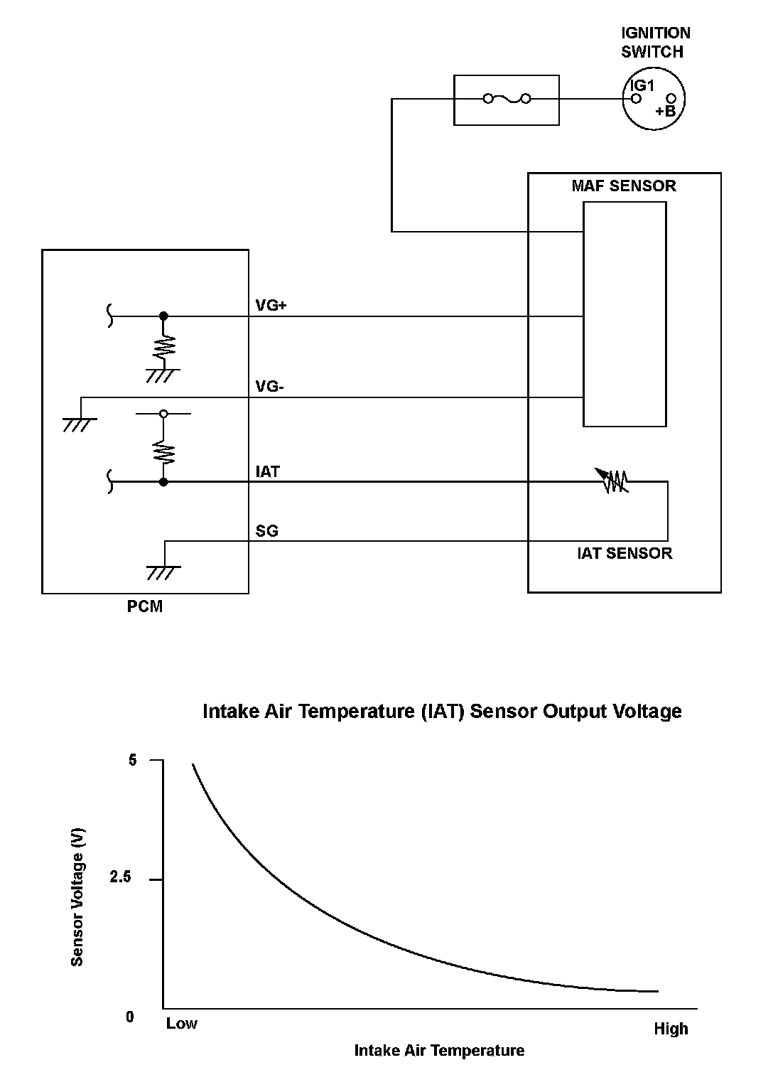 The intake air temperature (IAT) sensor is a thermistor that detects intake air temperature, and it is used for A/F feedback control to compensate for the atmospheric density fluctuations that accompany changes in intake air temperature. The IAT sensor resistance varies depending on temperature. The output voltage and the sensor resistance increase as the intake air temperature decreases. Conversely, the output voltage and the sensor resistance decrease as the intake air temperature increases. If the IAT sensor output voltage is excessively high, the powertrain control module (PCM) detects a malfunction and a DTC is stored.