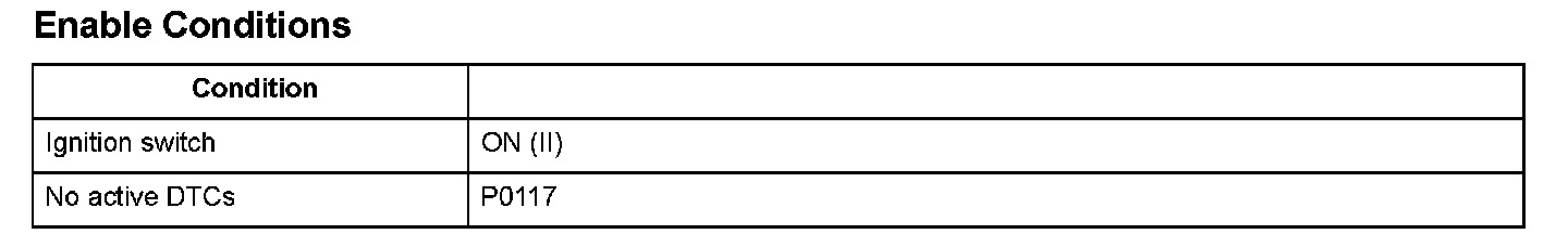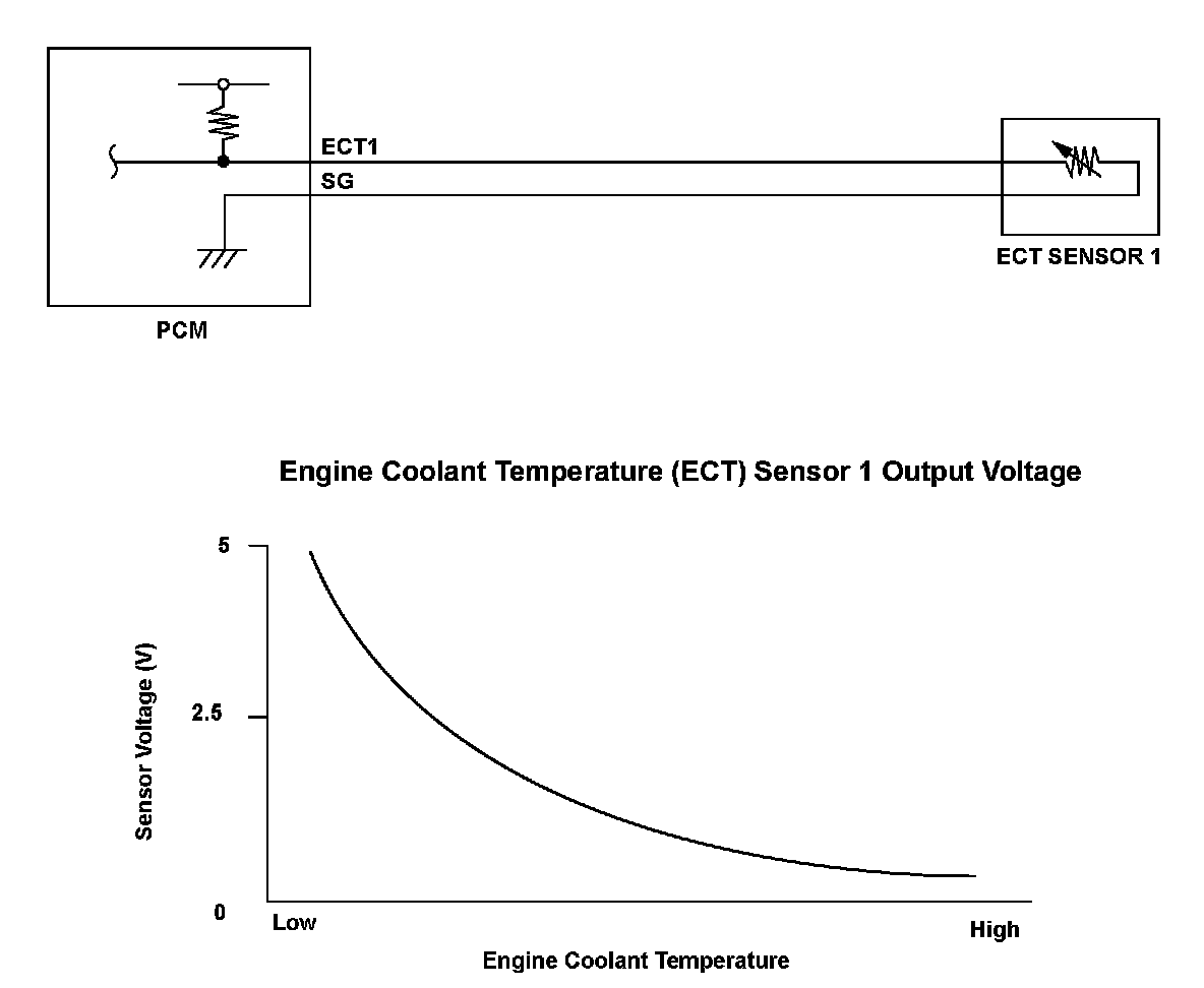 Engine coolant temperature (ECT) sensor 1 is used for air/fuel ratio feedback control, ignition timing control, idle speed control, and other functions. The ECT sensor 1 resistance varies depending on the engine coolant temperature. As the engine coolant cools, the ECT sensor 1 resistance increases, and the powertrain control module (PCM) detects a high signal voltage. As the engine coolant warms, the ECT sensor 1 resistance decreases, and the PCM detects a low signal voltage. If the ECT sensor 1 output voltage is a set value or more when the engine coolant temperature is low, the PCM detects a malfunction and a DTC is stored.