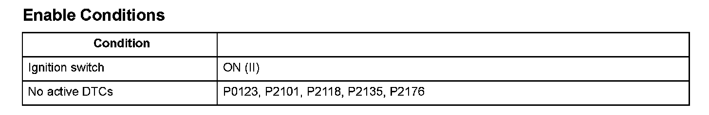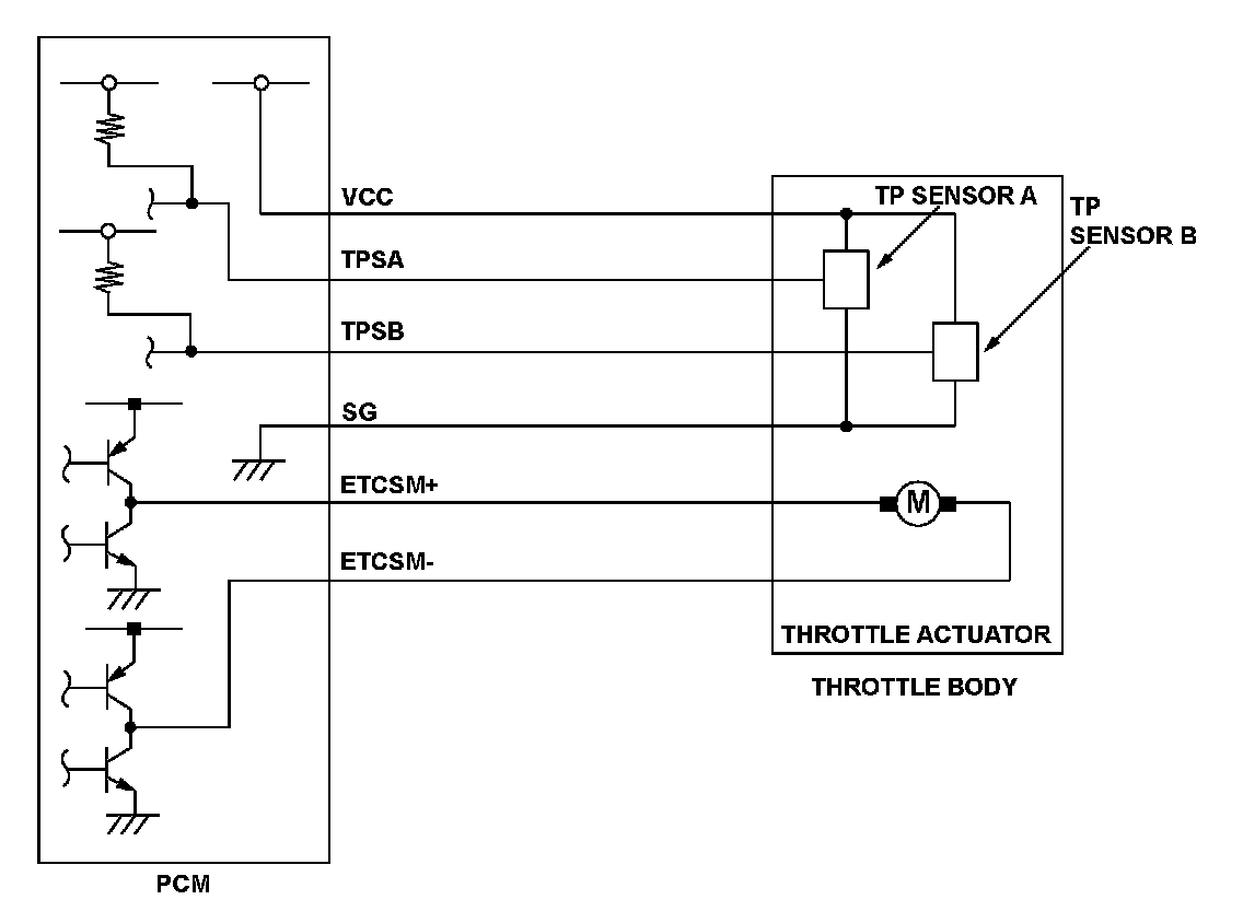 Throttle position (TP) sensor A is a semiconductor type, and it is attached to the throttle body and shaft to determine throttle valve position. The throttle valve position signal from TP sensor A is transmitted to the powertrain control module (PCM) for target position feedback control. If the signal from TP sensor A is less than a fixed value for a set time, the PCM detects a TP sensor A malfunction and stores a DTC.