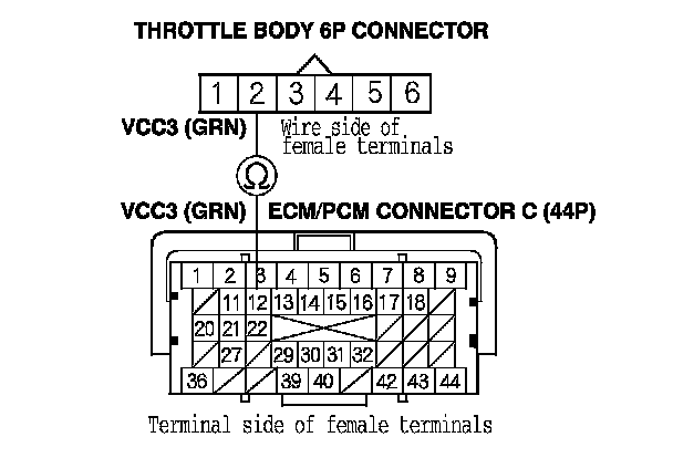 15. Check for continuity between ECM/PCM connector terminal C12 and throttle body 6P connector terminal No. 2.