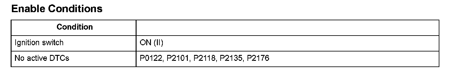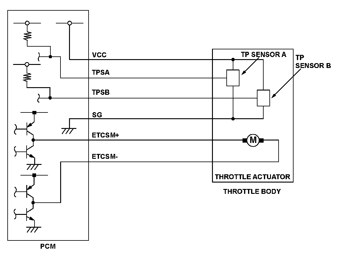 Throttle position (TP) sensor A is a semiconductor type, and it is attached to the throttle body and shaft to determine throttle valve position. The throttle valve position signal from TP sensor A is transmitted to the powertrain control module (PCM) for target position feedback control. If the signal from TP sensor A is more than a fixed value for a set time, the PCM detects a TP sensor A malfunction and stores a DTC.