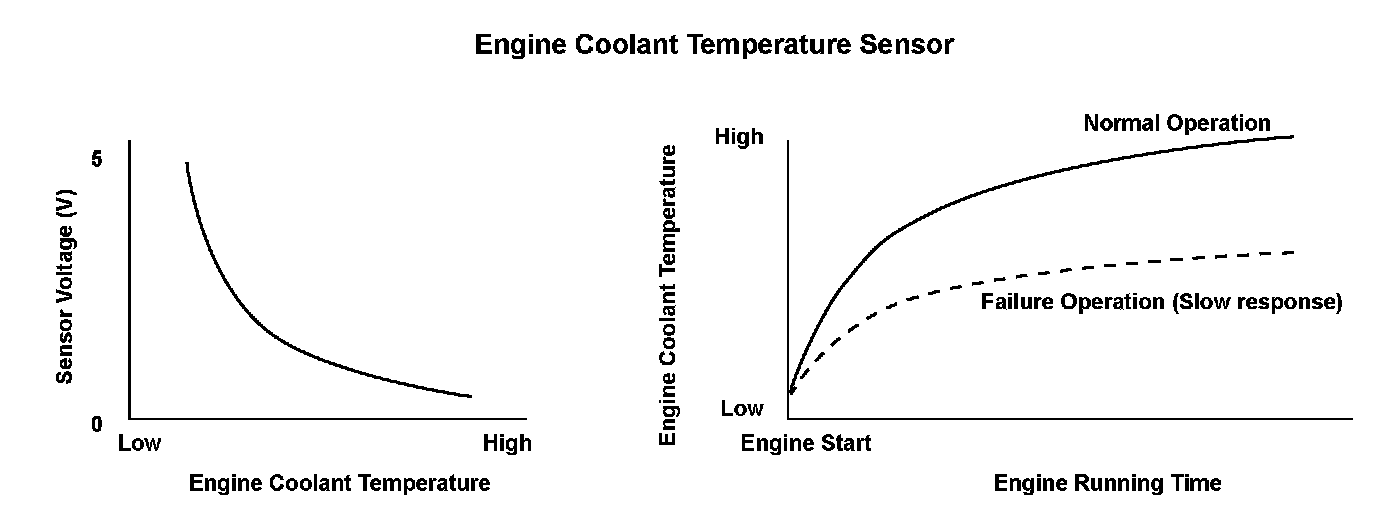 If the ECT sensor 1 output voltage does not reach a specified temperature at which closed-loop control for stoichiometric air/ fuel ratio starts within a set time, depending on the initial coolant temperature after starting the engine, the PCM detects a malfunction and a DTC is stored.
