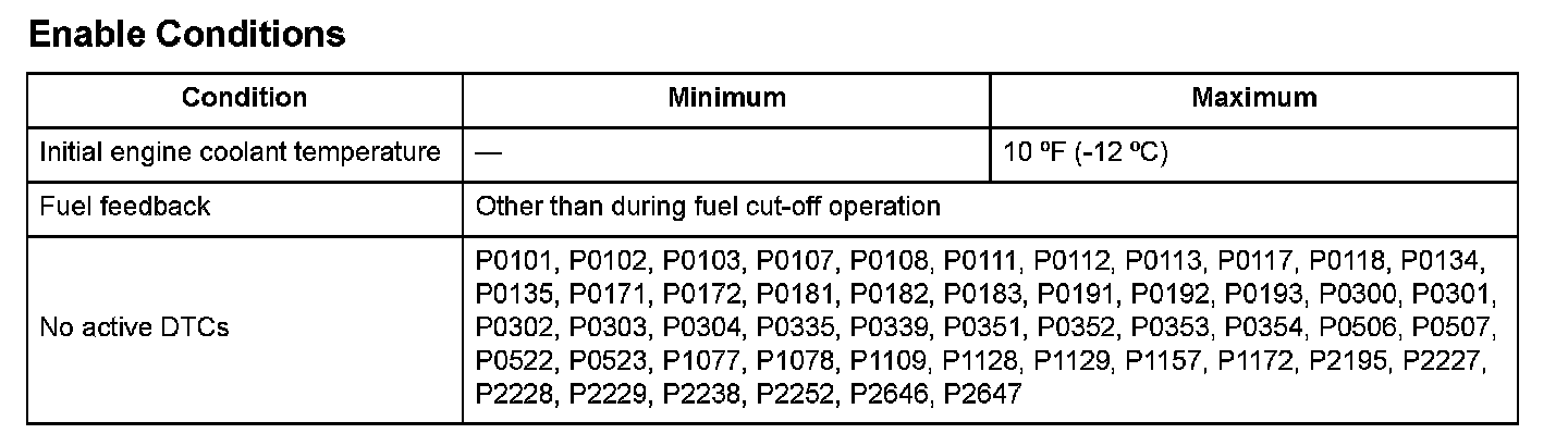 1. Start the engine at an engine coolant temperature as specified under Enable Conditions.