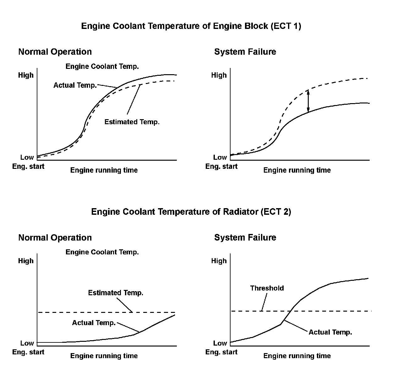 If the difference between the current measured coolant temperature at the radiator (ECT 2) and the initial coolant temperature at the radiator (ECT 2) is at least 44 °F (7 °C) when the calculated coolant temperature at the engine (ECT 1) reaches 163 °F (73 °C), a malfunction is detected (thermostat stuck open); or if the coolant temperature at the radiator (ECT 2) only reaches 71 °F (22 °C), a malfunction is detected (thermostat malfunction).