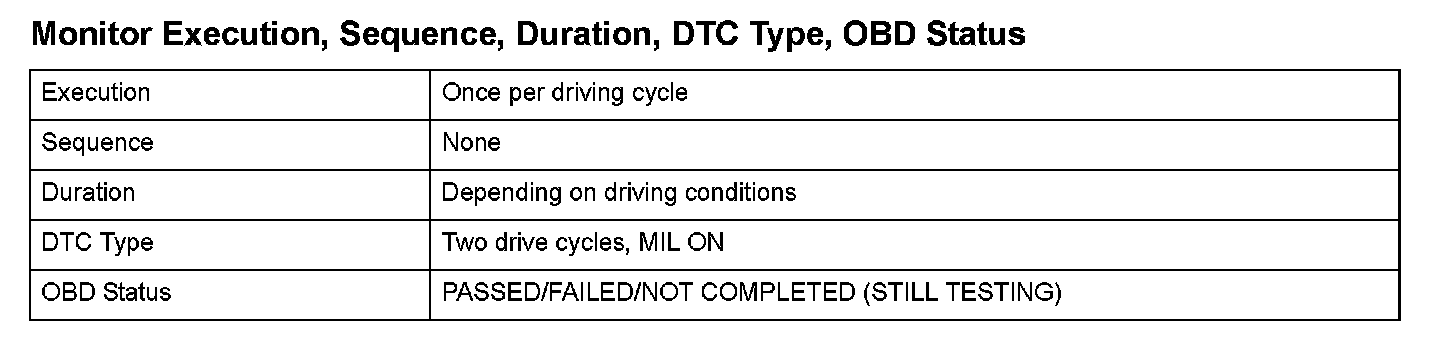 Monitor Execution, Sequence, Duration, DTC Type, OBD Status
