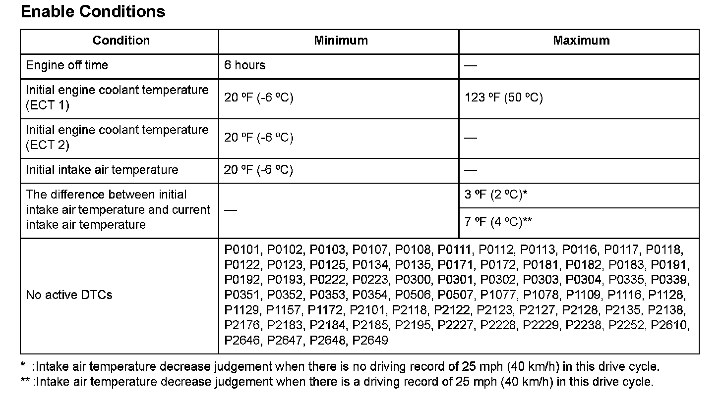 When a malfunction is detected during the first drive cycle with the ECT and IAT at engine start-up within the specified temperature range, a Temporary DTC is stored in the PCM memory. If the malfunction recurs during the next (second) drive cycle with the ECT and IAT at engine start-up within the specified temperature range, the MIL comes on and the DTC and the freeze frame data are stored.