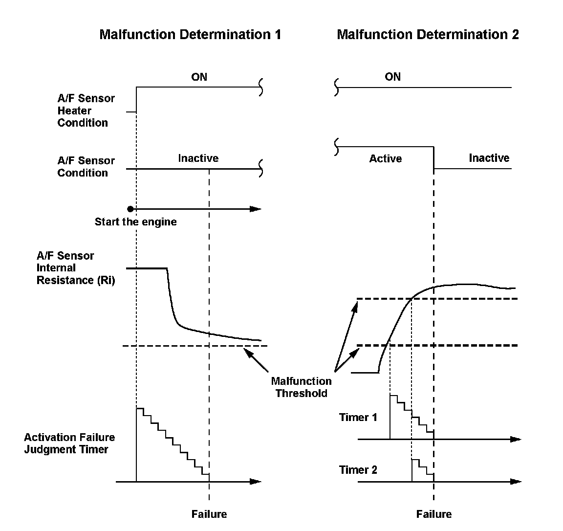 1. When the A/F sensor does not activate in a set time after the A/F sensor heater is turned on (with high A/F sensor internal resistance), a malfunction of the A/F sensor heater is detected, and a DTC is stored.