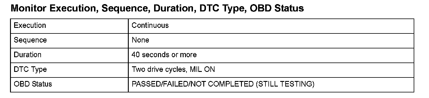 Monitor Execution, Sequence, Duration, DTC Type, OBD Status