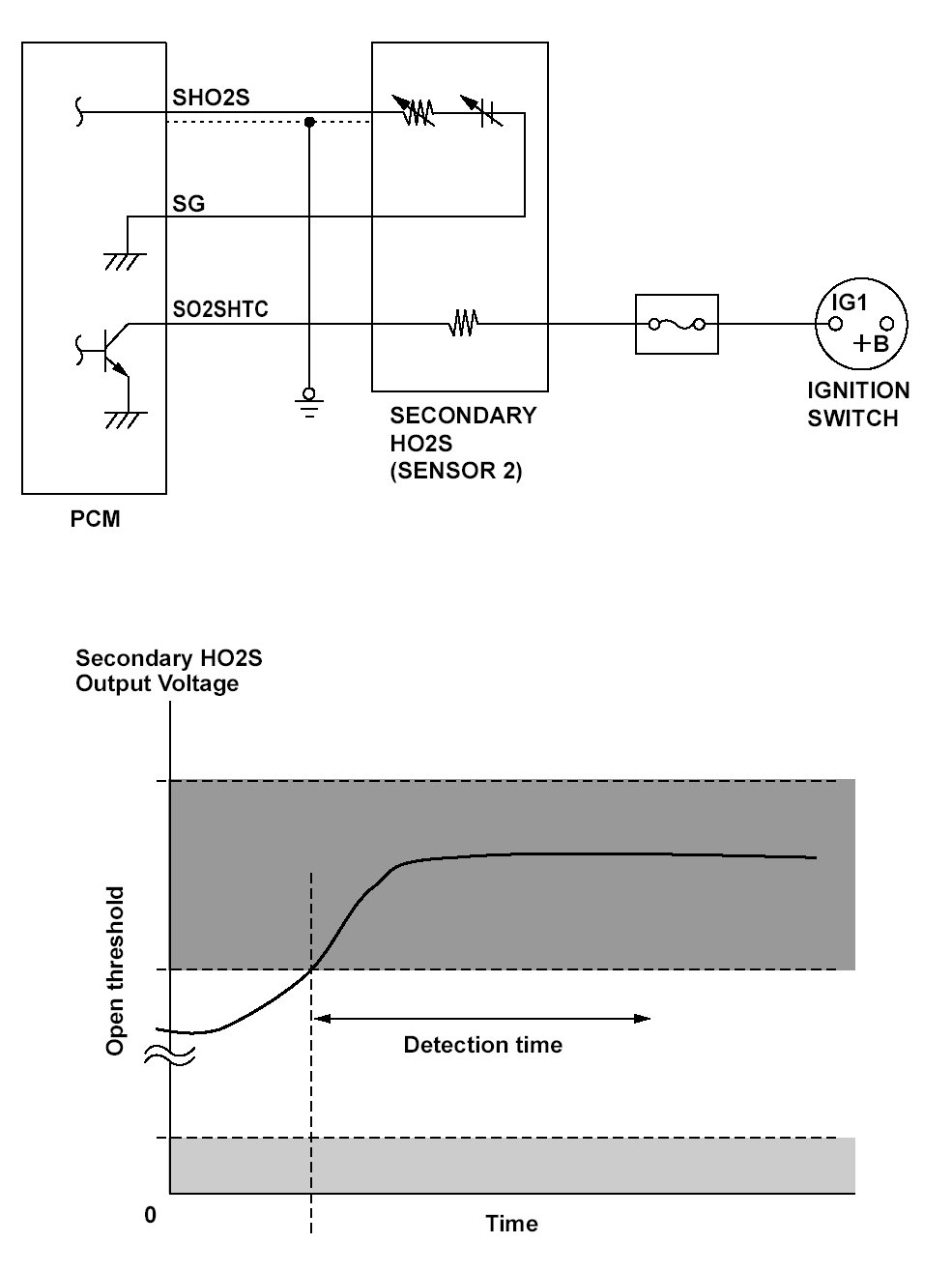 The secondary heated oxygen sensor (HO2S) (sensor 2) detects the oxygen content in the exhaust gas downstream of the three way catalytic converter (TWC) during stoichiometric air/fuel ratio feedback control based on the air/fuel ratio (A/F) sensor (sensor 1) output voltage. The secondary HO2S controls the air/fuel ratio from the A/F sensor output voltage to optimize TWC efficiency.