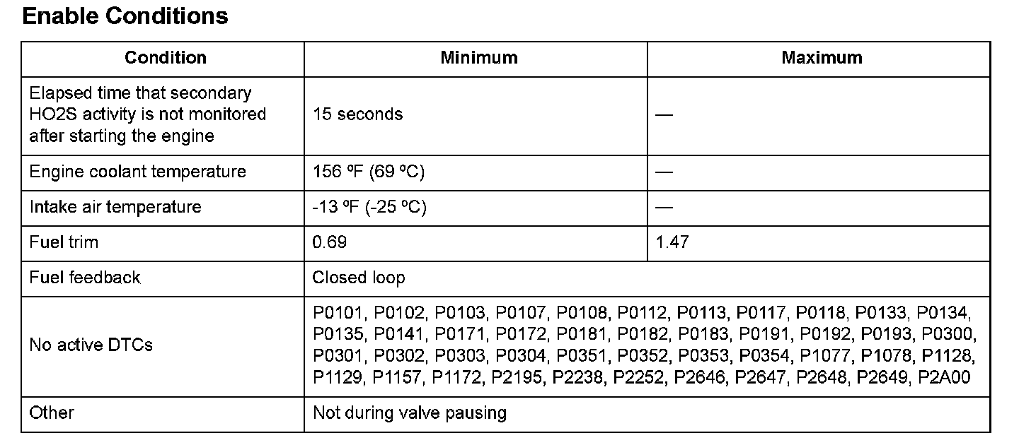 The secondary HO2S output voltage is 1.270 V or more for at least 5 seconds.